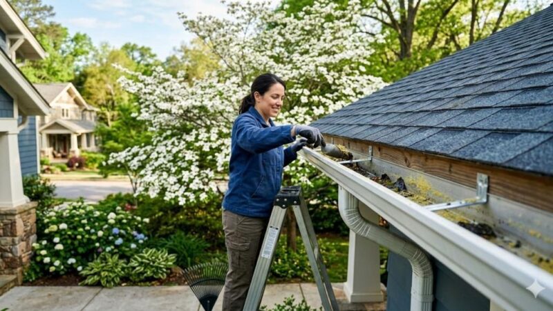 Atlanta Home Maintenance Checklist: A Seasonal Guide for Homeowners Homeowner cleaning roof gutters on a craftsman-style house during spring in Atlanta